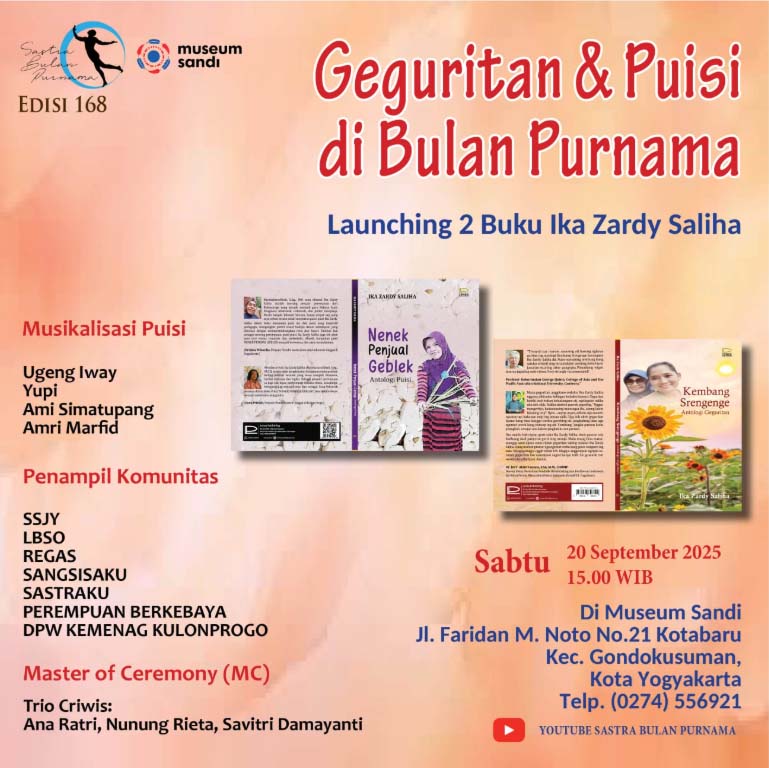 Dua buku sastra, geguritan dan puisi karya Ika Zardi Zaliha akan diluncurkan di Sastra Bulan Purnama edisi 168, Sabtu, 20 September 2025, pkl. 15.30 di Museum Sandi Jl. Faridan M Noto No.21, Kotabaru, Kec. Gondokusuman, Kota Yogyakarta, Daerah Istimewa Yogyakarta 55224. Atau di utara Raminten dan Balai Bahasa Yogyakarta, atau sebelah barat SMA Stella Duce 1, Kotabaru, atau juga sebelah selatan ban-ban Gondolayu.