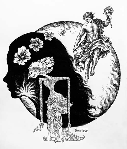 Khayangan, nama untuk menyebut tempat yang jauh tak tersentuh. Tempat Dewa-Dewa bersemanyam. Ketika Dewa hendak turun ke bumi, Ia menjelma mejadi makhluk yang dikenali. Dalam kisah yang telah dikenal, Dewa Wisnu menjelma menjadi makhluk yang bisa dikenali dan karena terpikat pada Dewi Bumi, keduanya bersenggama, laiknya suami istri.