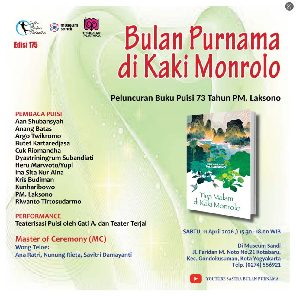 Puisi-puisi yang terkumpul dalam buku karya PM. Laksono dan diberi judul ‘Tiga Malam di Kaki Monrolo” akan dibacakan Sabtu 11 April 2026 pkl 15.30 di Museum Sandi Jl. Faridan M Noto No.21, Kotabaru, Kec. Gondokusuman, Kota Yogyakarta, Daerah Istimewa Yogyakarta 55224. Atau di utara Raminten dan Balai Bahasa Yogyakarta, atau sebelah barat SMA Stella Duce 1, Kotabaru, atau juga sebelah selatan ban-ban Gondolayu.